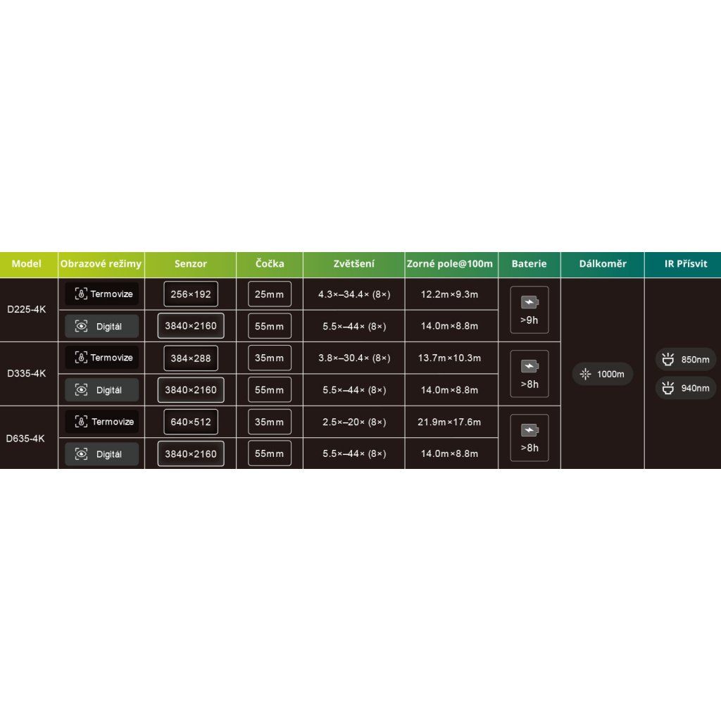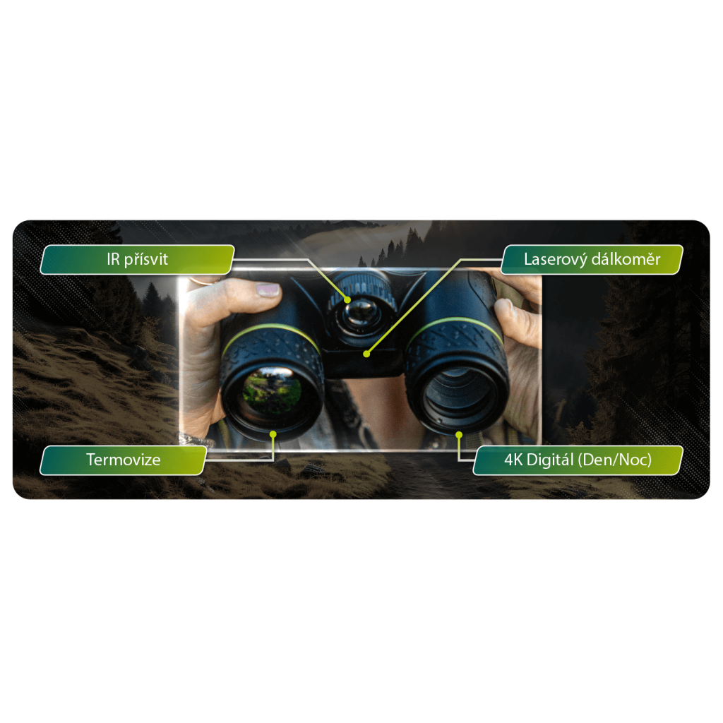 - 4v1 technologie – termovize, denní dalekohled, noční vidění a laserový dálkoměr v jednom těle