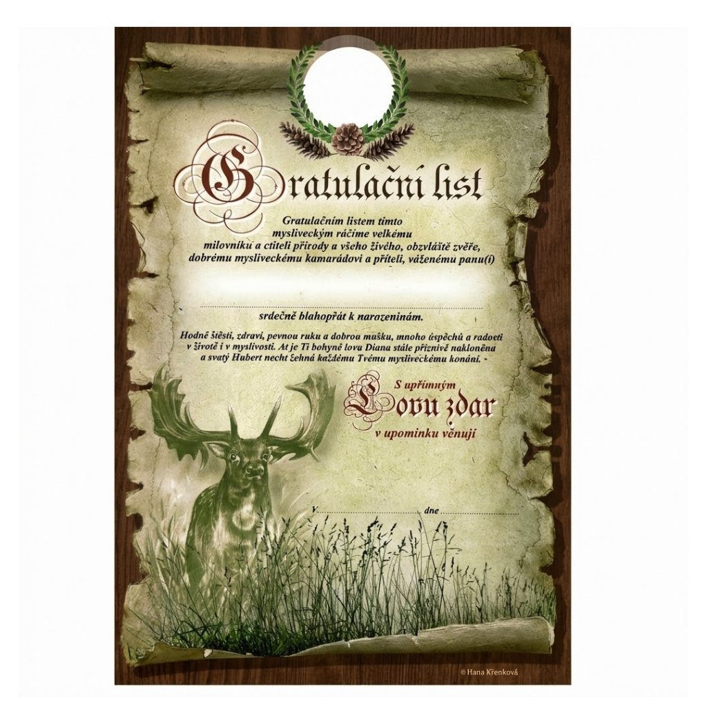 Gratulační list - pěkná památka na významné životní jubileum od mysliveckých přátel pro myslivecké přátele. Autorka kresby je p. Hana Křenková - česká výtvarnice věnující se aktivně myslivosti.