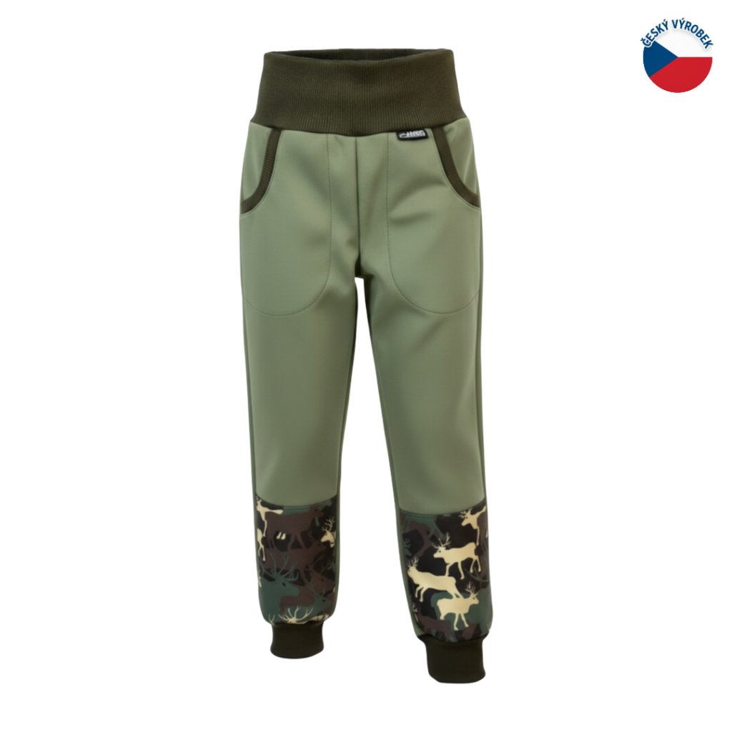 ZÁHOŘÍ Dětské softshellové kalhoty - zelené s jeleny