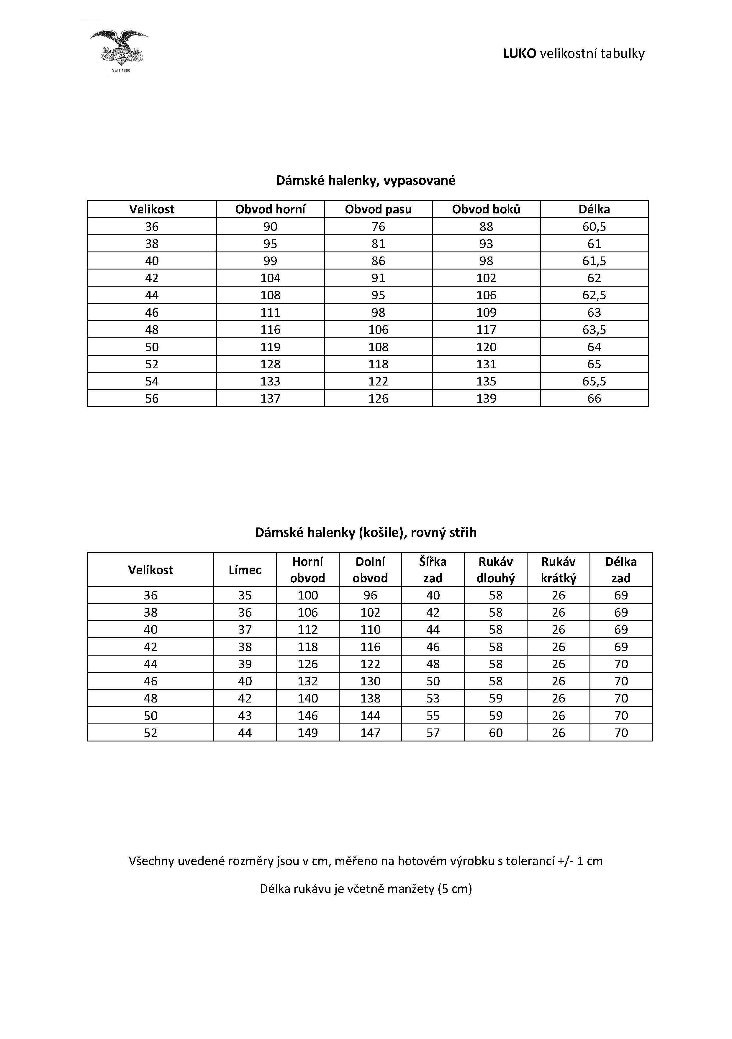 Velikost košile je dána obvodem krku v cm (velikostní tabulka).