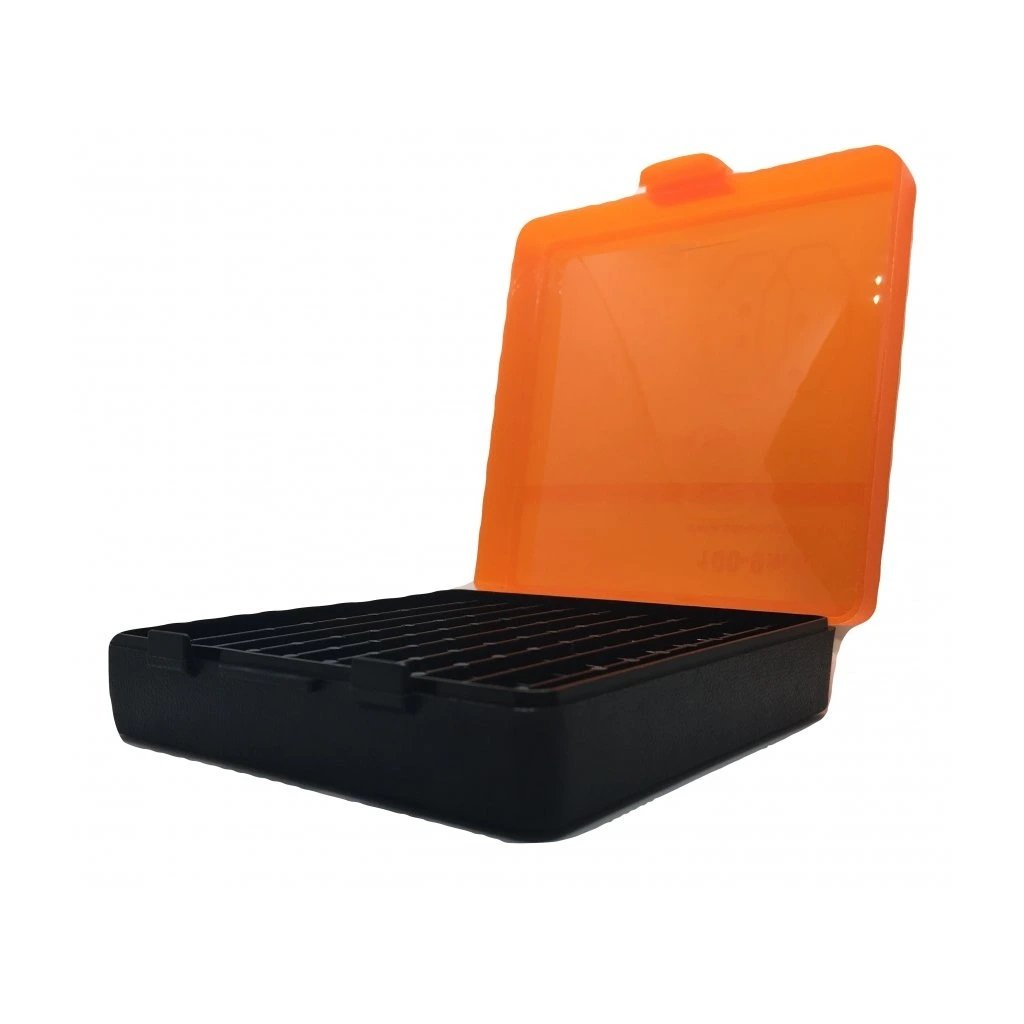 Uzavíratelná krabička na náboje ráže 9 mm. Díky krabičce máte přesný přehled o počtu vystřelených nábojů a kontrolu nad jejich přepravou. Do jedné krabičky se vejde 100 kusů nábojů. Spodní a vrchní díl lze od sebe snadno oddělit.