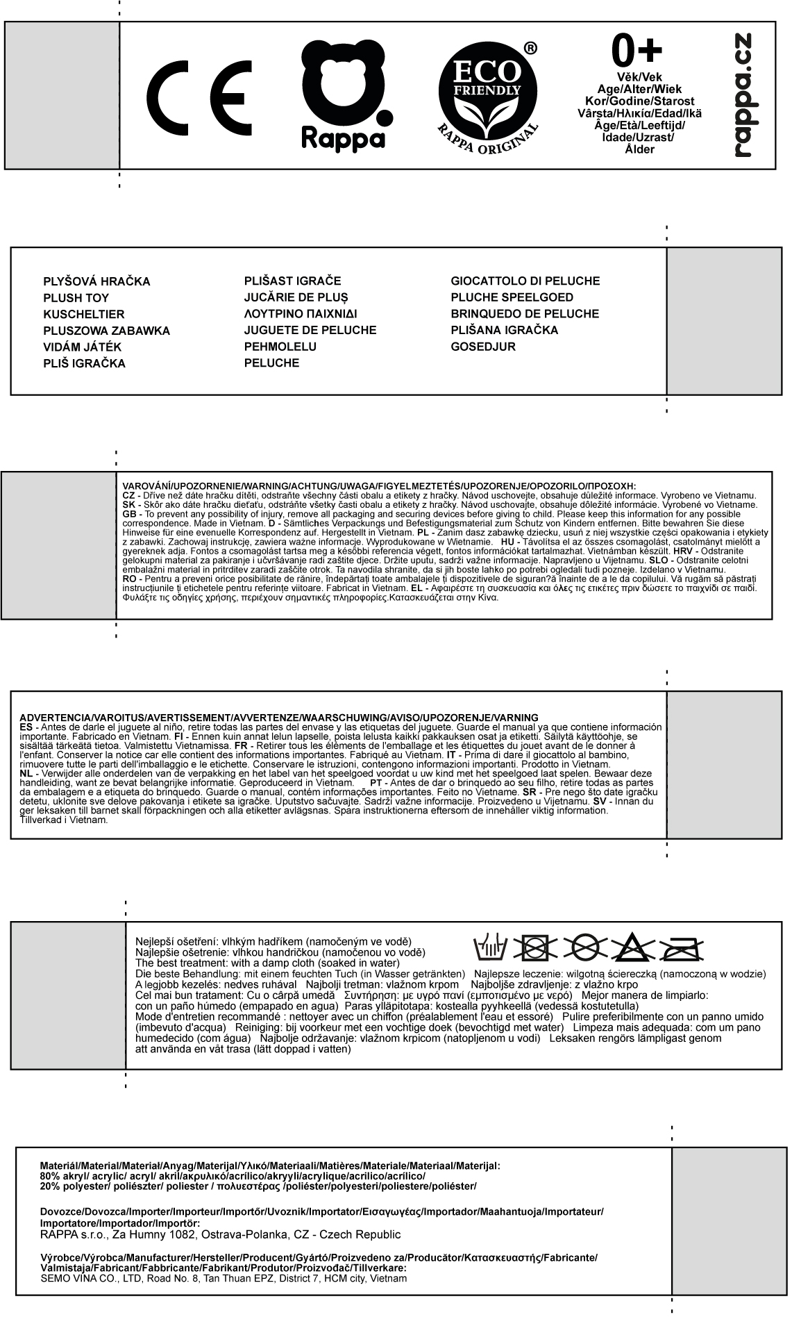 ECO-FRIENDLY - výplň plyšové hračky je vyrobena z recyklovaných PET lahví. Tento materiál je zcela bezpečný, na omak nerozeznatelný od standardní výplně a plně atestovaný pro bezpečnost i těch nejmenších.