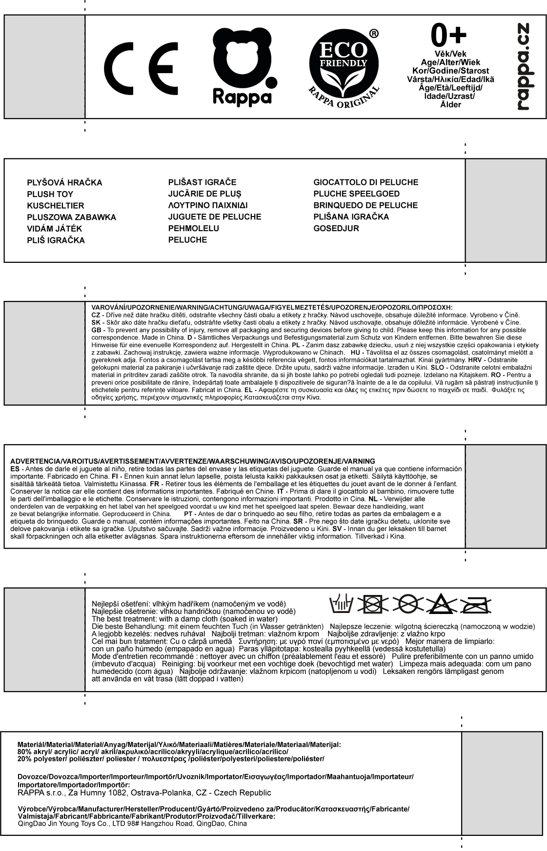 ECO-FRIENDLY - výplň plyšové hračky je vyrobena z recyklovaných PET lahví. Tento materiál je zcela bezpečný, na omak nerozeznatelný od standartní výplně a plně atestovaný pro bezpečnost i těch nejmenších.