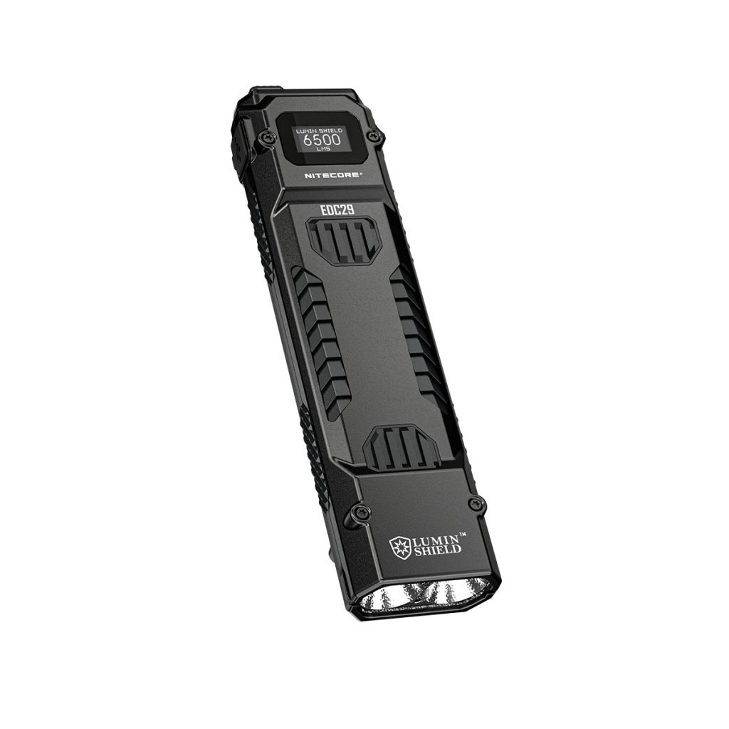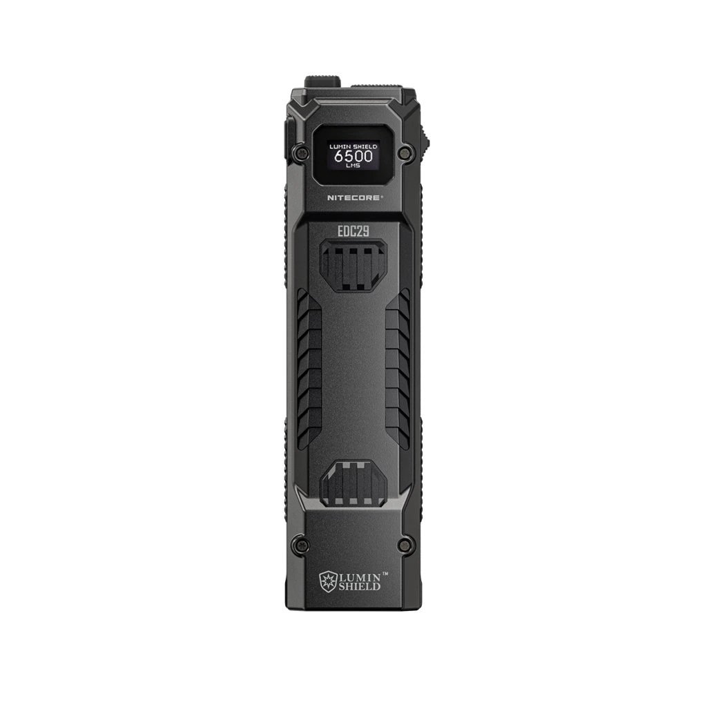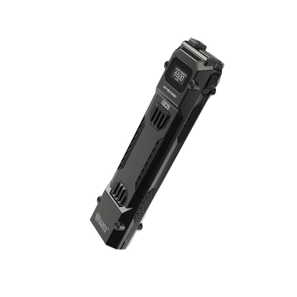 Plochá svítilna řady Nitecore EDC. Model EDC29 LUMINBLADE má tělo vyrobené z nerezové oceli. Díky novým led se prodloužil dosvit až na 400 metrů s vysokým výkonem světelného toku 6 500 lm a intenzitou světelného kuželu (40 230cd). 2x LED UHi 20 MAX ve dvou reflektorech jsou nastavené na rozptýlený resp. zaostřený světelný kužel. V nejsilnějším režimu LUMIN SHIELD (rozptýlené světlo) dává světelný tok 6500 lm / 35360 cd resp. režimu SEARCH (zaostřené světlo) je to 3000 lm / 40230 cd. Lumin Shield resp. Strobe jsou funkce navolitelné pro přímé ovládání samostatným spínačem. V obou nejvýkonnějších režimech je použitelnost řádově nízké desítky sekund, než se přepne do úspornějšího módu. Standardní světelné režimy jsou čtyři: ULTRALOW - LOW - MID - HIGH.