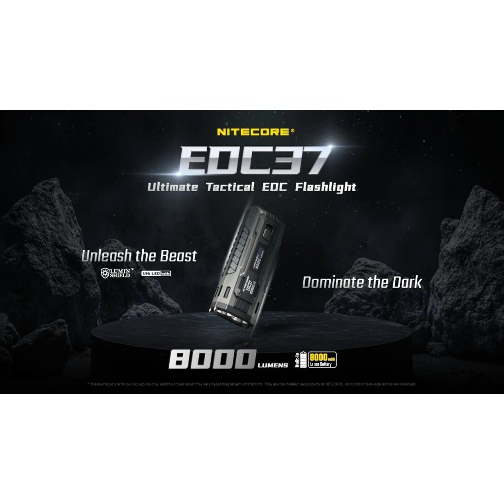 Plochá svítilna řady Nitecore EDC. Model EDC37 má tělo vyrobené z nerezové oceli. Díky novým led se prodloužil dosvit až na 420 metrů s vysokým výkonem světelného toku 8 000 lm a intenzitou světelného kuželu (44 010cd).2x NiteLab UHi 20 MAX LEDs ve dvou reflektorech jsou nastavené na rozptýlený resp. zaostřený světelný kužel. V nejsilnějším režimu LUMIN SHIELD (rozptýlené světlo) dává světelný tok 8000 lm / 44010 cd resp. režimu SEARCH (zaostřené světlo) je to 3000 lm / 44010 cd. Lumin Shield resp. Strobe jsou funkce navolitelné pro přímé ovládání samostatným spínačem. V obou nejvýkonnějších režimech je použitelnost řádově nízké desítky sekund, než se přepne do úspornějšího módu. Standardní světelné režimy jsou čtyři: ULTRALOW - LOW - MID - HIGH.